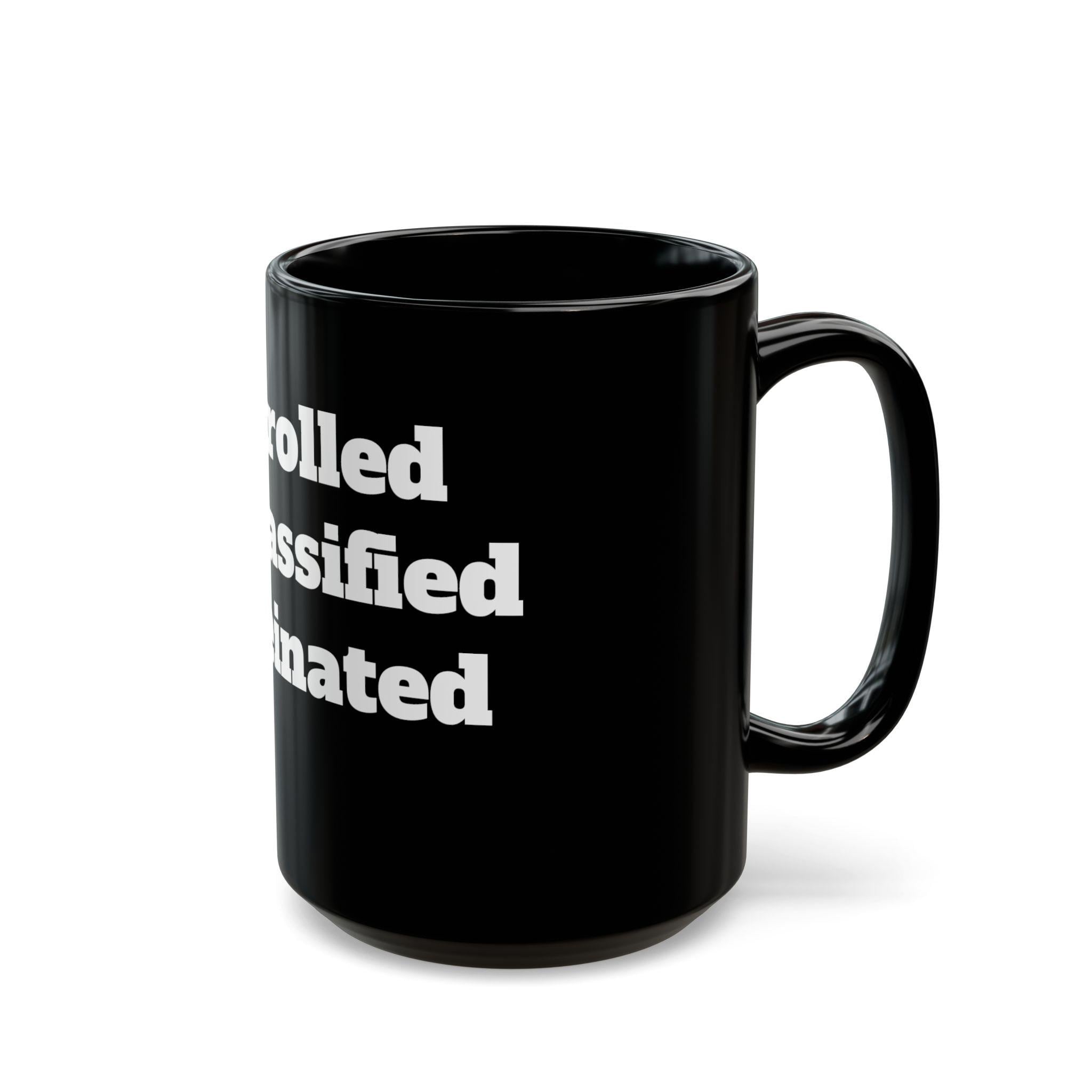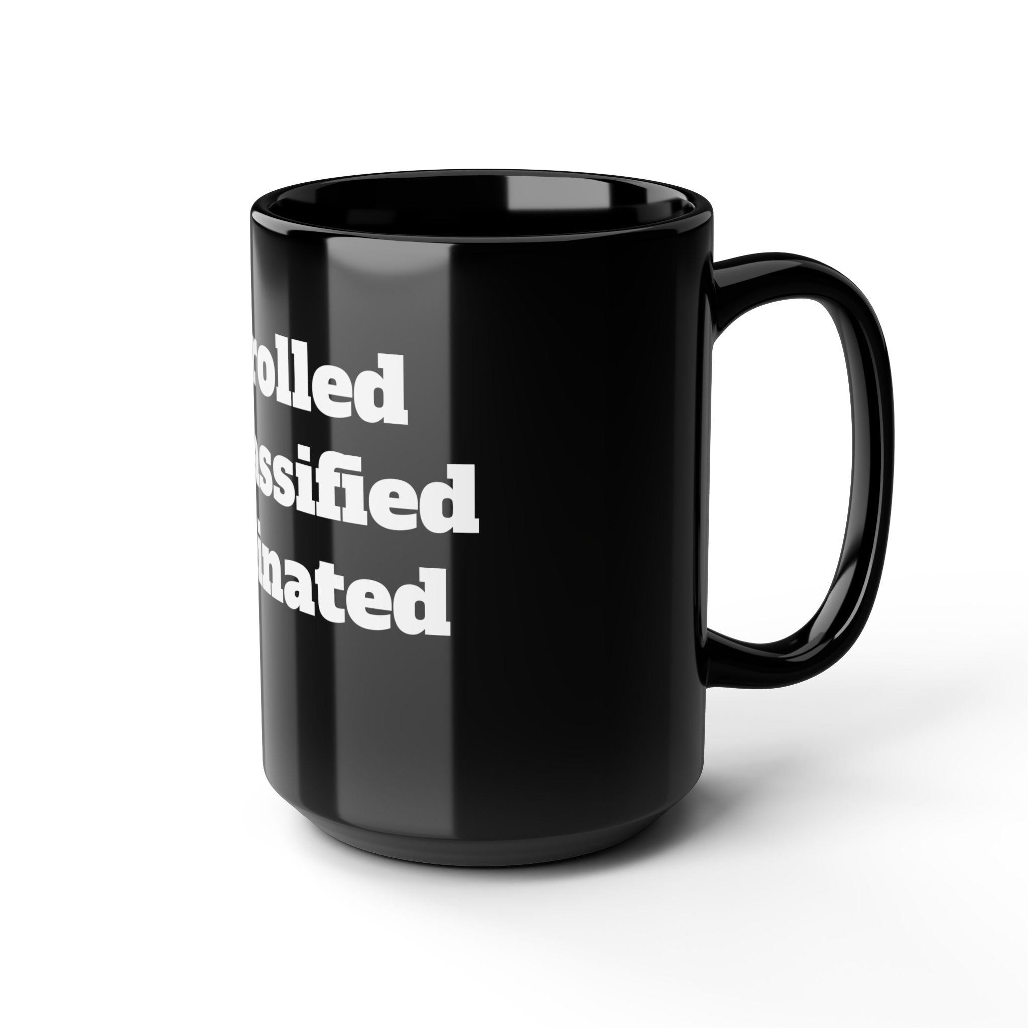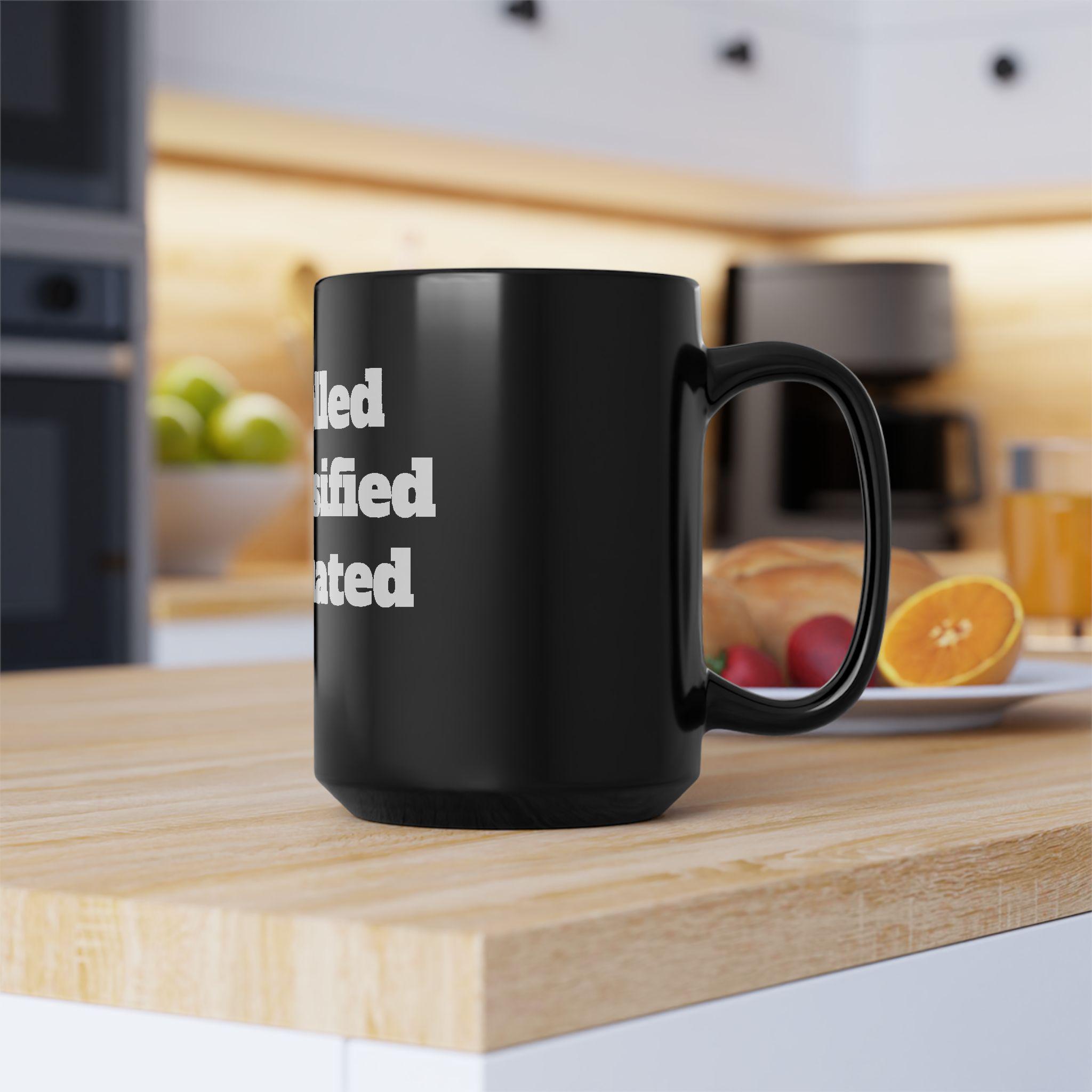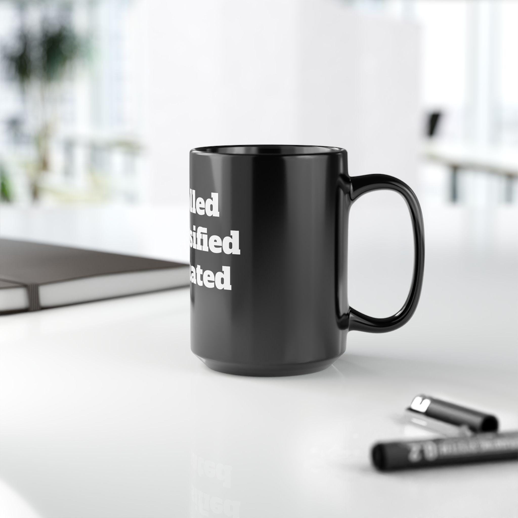A glossy black ceramic mug with bold white typography that reads like a quick, witty manifesto. The heavy, high-contrast lettering wraps around the mug’s face, giving it attitude and presence on a cluttered desk or a quiet kitchen counter. It feels like a private inside joke between colleagues during a morning stand-up, or a deliberate statement on the home office shelf. The weight and shine of the black glaze make the white print pop, and the comfortable C-shaped handle keeps your grip steady through long brews. Choose 11oz for a compact, focused cup or 15oz when you need that extra pour to power through late-night edits or long planning sessions.