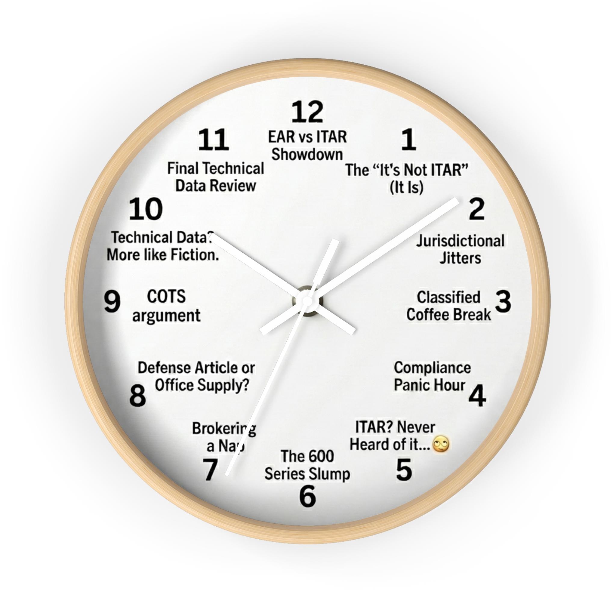 This 10" wall clock brings a wry, tongue-in-cheek pulse to a workspace that lives on deadlines and specifications. The bold lettering — a nod to the chaotic rhythms of export controls and regulatory headaches — reads like inside humor for engineers, compliance officers, and anyone who spends their days decoding dense acronyms. Hang it above a cluttered desk or in a quiet conference room to remind colleagues that even in tense moments, there’s room for a knowing grin. The smooth wood frame and plexiglass face keep the look professional while the vibrant print adds character. It’s built to blend into workspaces where precision matters and a little levity helps the hours pass with a lighter step.